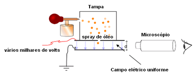 Foi através de uma importante experiência que realizou, onde utilizou uma câmara de gotas de óleo para medir a carga elementar (esquema apresentado em baixo). Mostrou que a carga elétrica, seja positiva ou negativa, é sempre um múltiplo inteiro da carga elementar que apresenta o valor de: