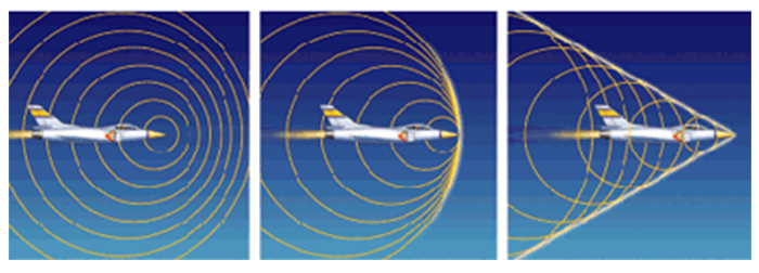 À medida que o avião acelera, essas ondas vão se juntando e ficando como que empilhadas à sua frente, como uma série de fios entrelaçados, como se pode observar na figura apresentada em baixo: